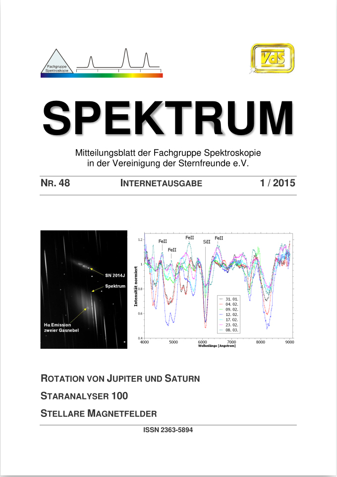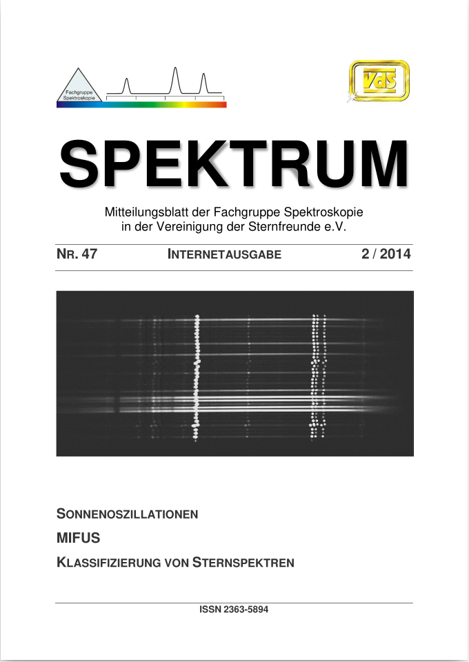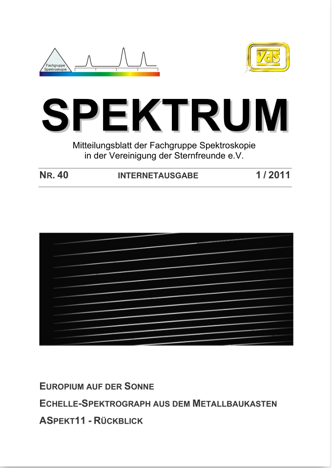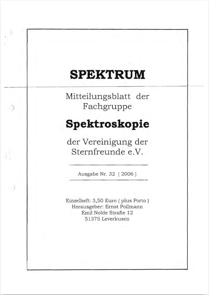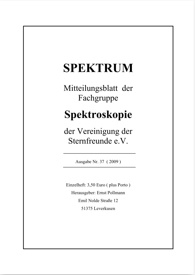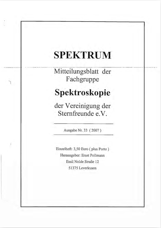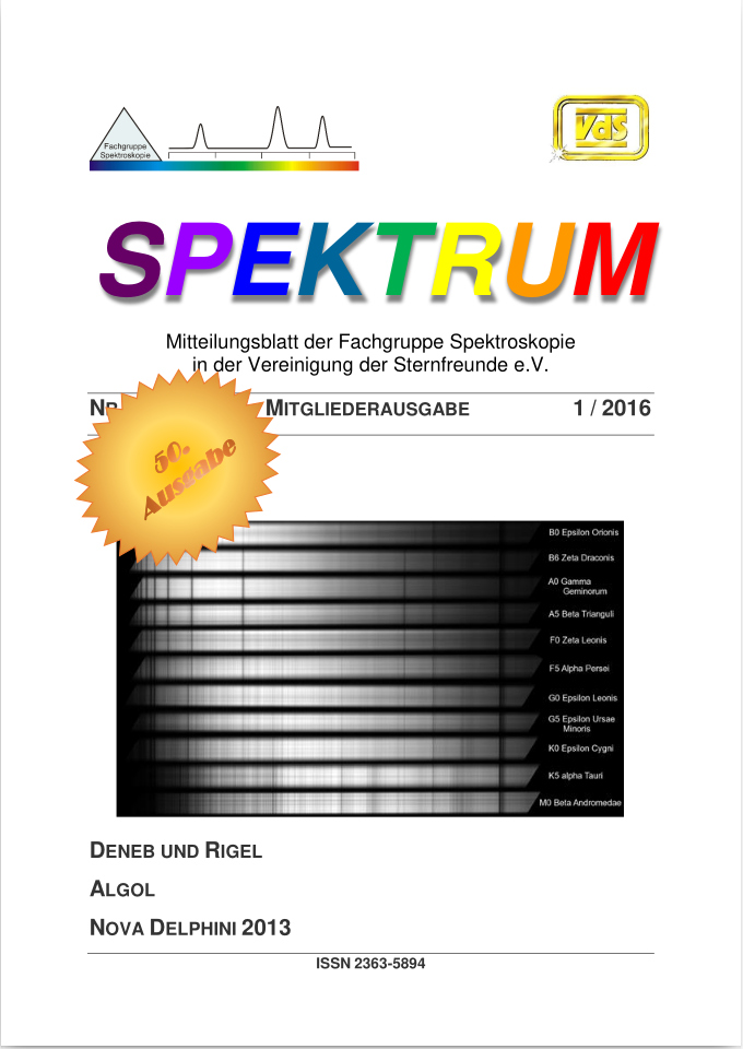 SPEKTRUM (ISSN 2363-5894) is the world's oldest ProAm Journal for spectroscopy. The text can be written in German and English. Dr. Thomas Hunger is our current editor and publisher. Please send all contributions to him.
