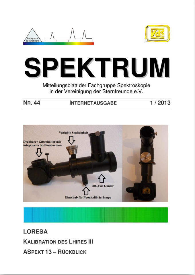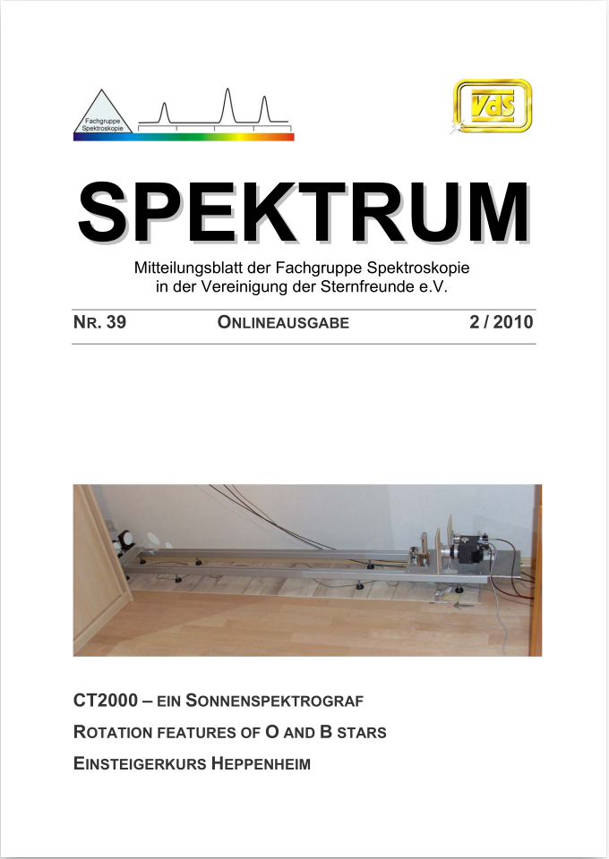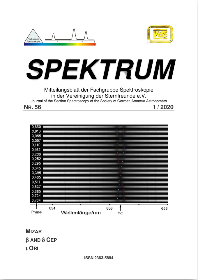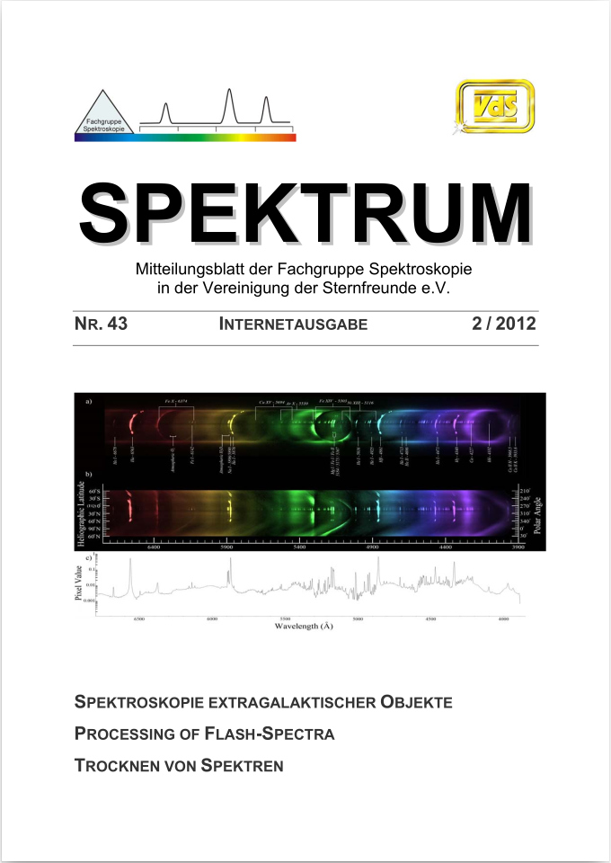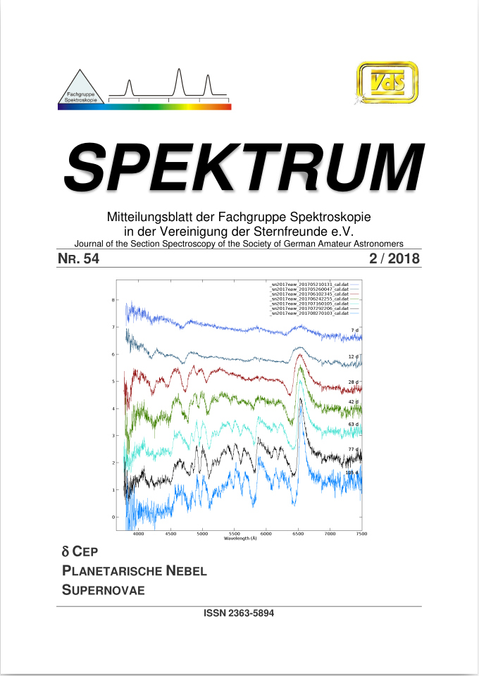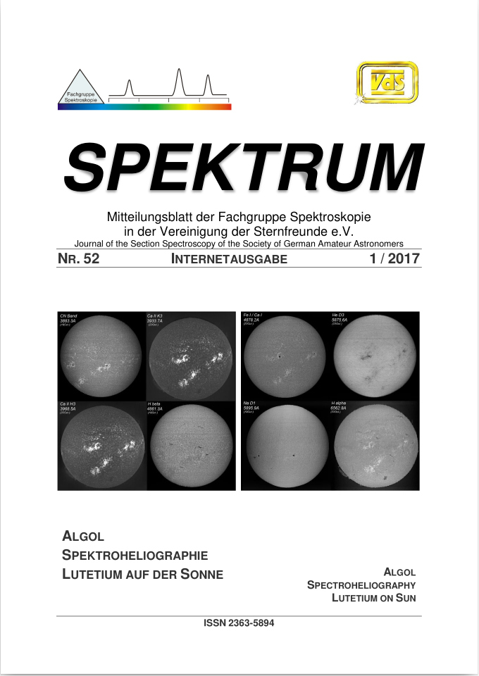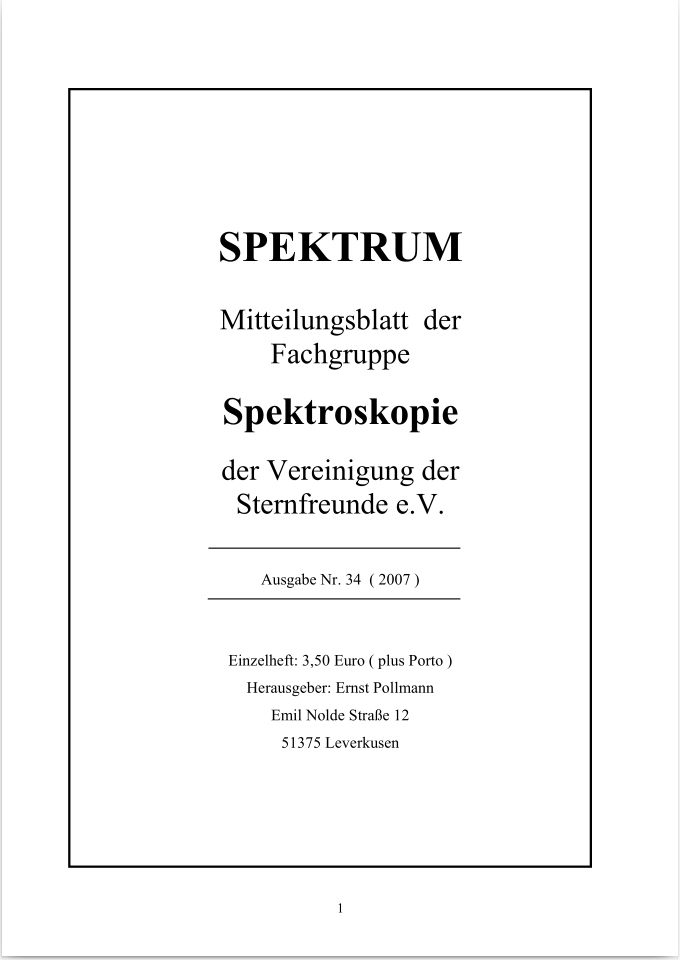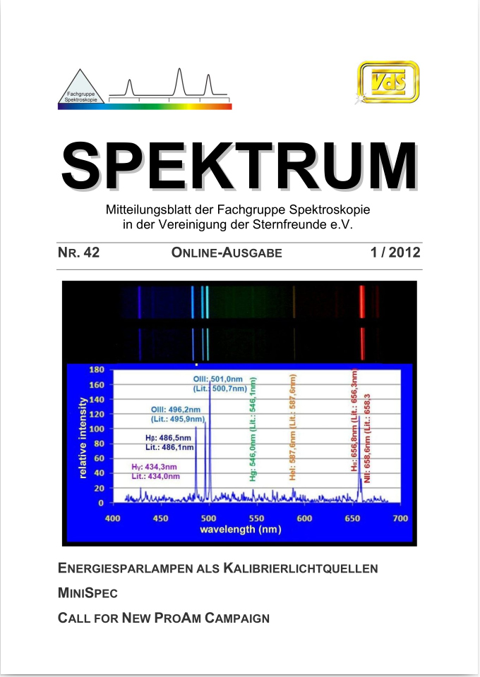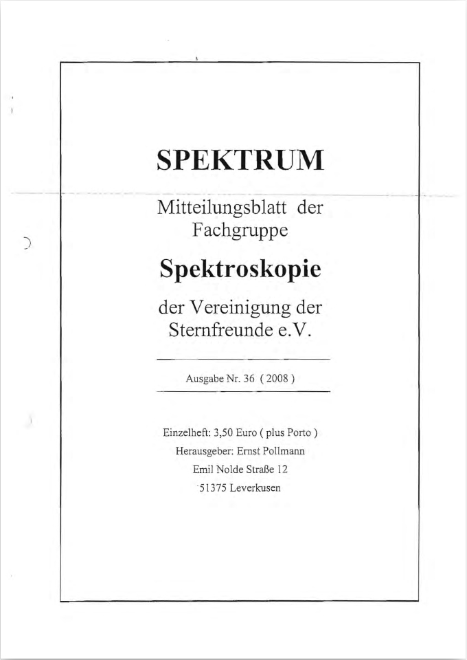SPEKTRUM (ISSN 2363-5894) ist das weltweit älteste ProAm-Journal zur Spektroskopie. Der Text kann in deutsch und englisch verfasst werden. Dr. Thomas Hunger ist unser aktueller Redakteur und Herausgeber. Bitte alle Beiträge an ihn.