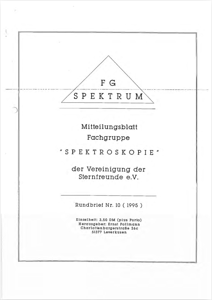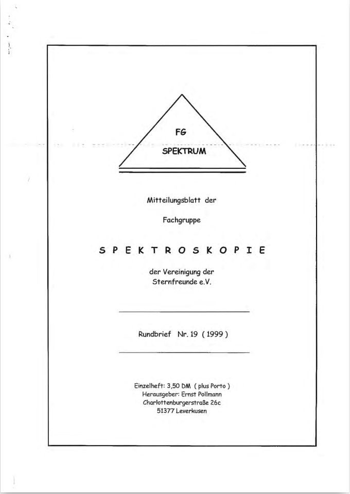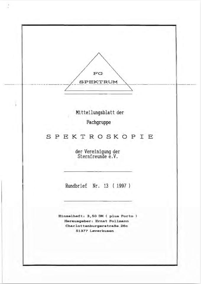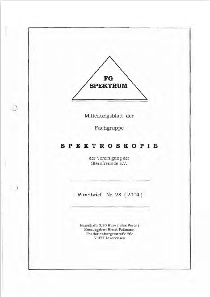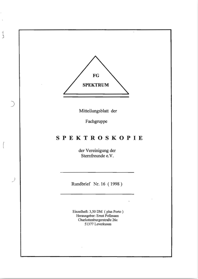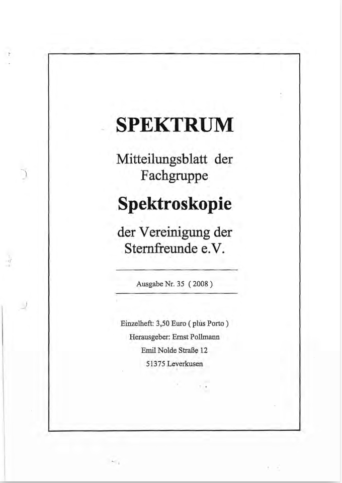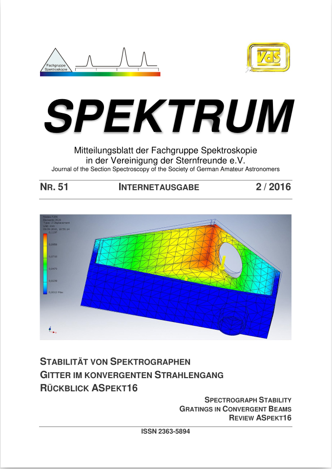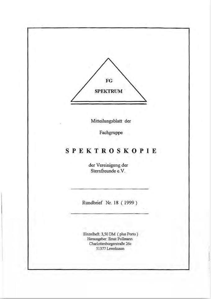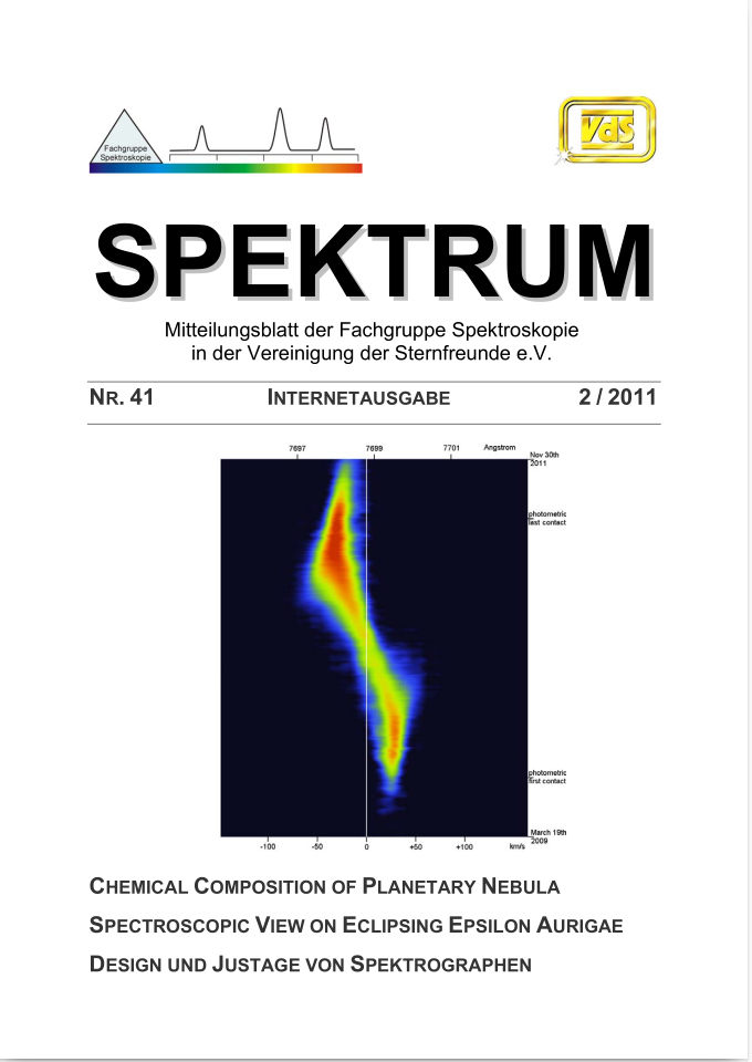 SPEKTRUM (ISSN 2363-5894) ist das weltweit älteste ProAm-Journal zur Spektroskopie. Der Text kann in deutsch und englisch verfasst werden. Dr. Thomas Hunger ist unser aktueller Redakteur und Herausgeber. Bitte alle Beiträge an ihn.